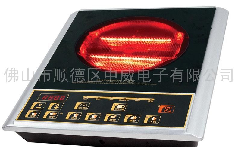 进品黑晶板,坚固耐用;四位数码显示加七彩指示触摸,热效率高,火锅、爆炒、烧烤、煲粥汤、烧水,温酒热奶烹饪功能,童锁、定时预约。超低电